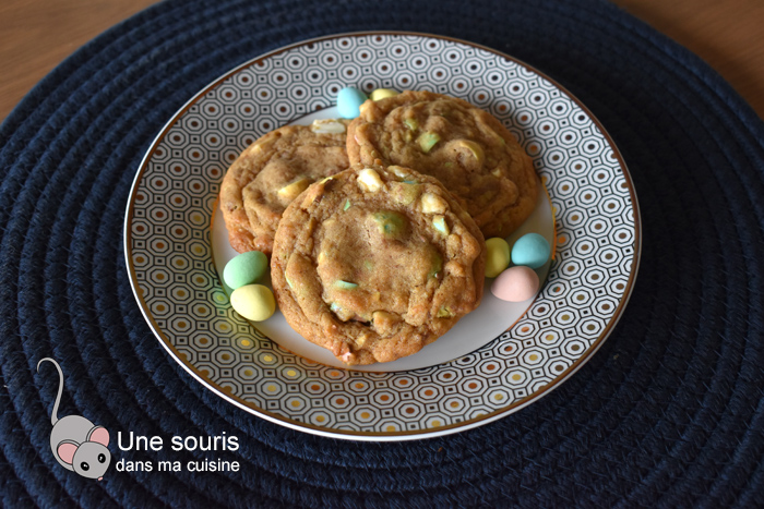 Dans un autre registre, je vous propose une recette de biscuits aux mini-oeufs (ou si vous préférez aux Mini Eggs de Cadbury pour rester dans l’esprit britannique). J’ai pris cette recette sur le site de 5 ingrédients, 15 minutes.