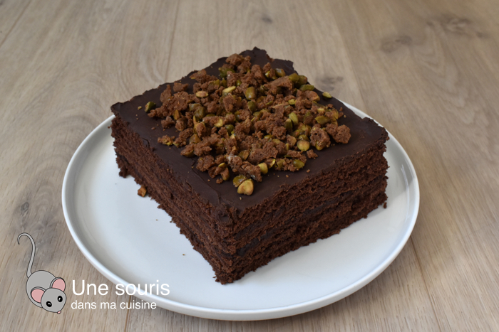 Déposer une tranche de gâteau sur un plat de service. Répartir un quart de la ganache. Couvrir avec un autre morceau de gâteau et garnir avec un autre quart de la ganache. Répéter l’opération. Parsemer le dessus du gâteau avec le croustillant aux pistaches. Réserver à température ambiante sous une cloche à gâteau. Servir et déguster avec gourmandise.
