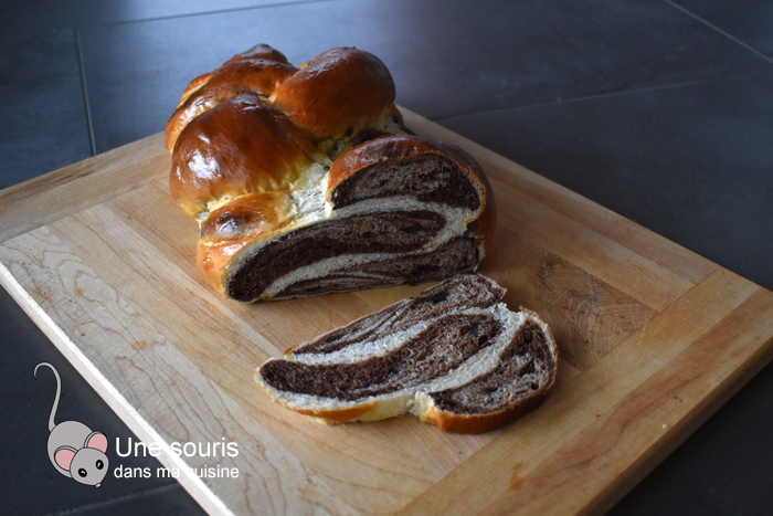 Transférer la pâte dans le moule et l’étirer dans un sens. Verser la moitié de la confiture et répartir la moitié du chocolat. Étirer à nouveau la pâte avant de la replier sur elle-même. Étirer la pâte dans l’autre sens, puis répartir le restant de confiture et de chocolat. Étendre de nouveau la pâte puis la replier sur elle-même. Étaler légèrement la pâte pour l’aider à prendre la forme du moule. Laisser lever à température ambiante pendant 2 à 4 heures ou jusqu’à ce que la pâte ait doublé de volume.